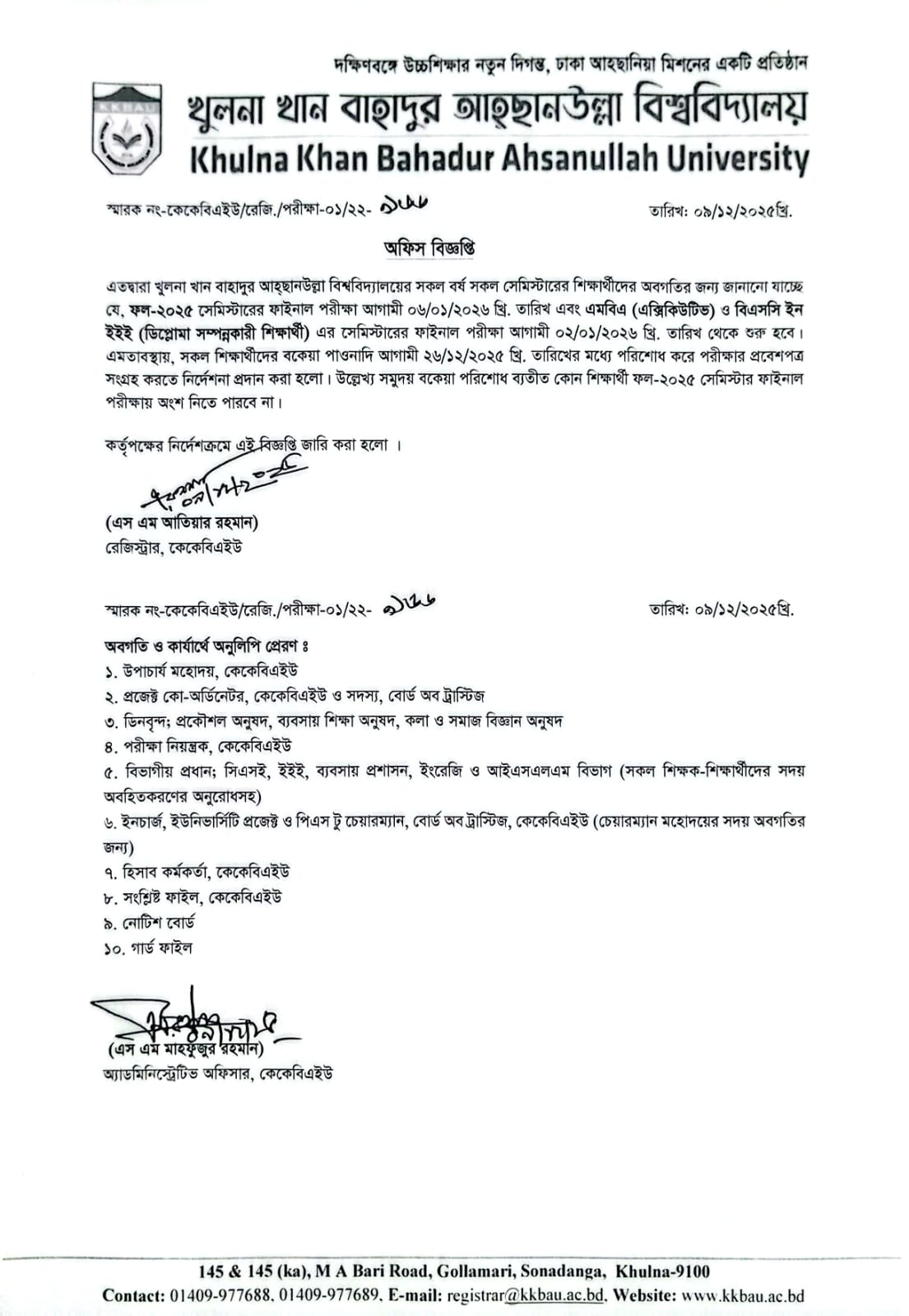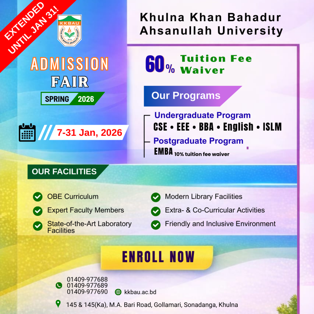 Welcome to Khulna Khan Bahadur Ahsanullah University, also known as KKBAU. It is an eminent pleasure to announce that Khulna Khan Bahadur Ahsanullah University (KKBAU) is one of the few leading and promising private Universities in Khulna, Bangladesh. Khulna Khan Bahadur Ahsanullah University got its approval from UGC in 2018 and is located at 145 & 145(Ka), M.A. Bari Road, Gollamari, Sonadanga, Khulna, Bangladesh. It started its noble academic journey in 2022 under the remarkable direction of the UGC. The University comprises four Faculties under which five Departments offer degrees like B.Sc. in Computer Science and Engineering, B.Sc. in Electrical and Electronic Engineering and Business Administration, English and Information Science, and Library Management. Very recently, about 2.24 acres of land have been purchased as the main campus area to construct modern civil infrastructure, develop its ongoing research and education, and expand the scope of opening a few new Departments.
